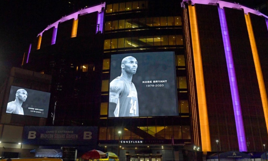 As the Knicks prepared to take on the Brooklyn Nets inside the arena, mourners snapped photos of the illuminated exterior and an electronic billboard that featured a giant black-and-white image of Bryant facing West 33rd Street.