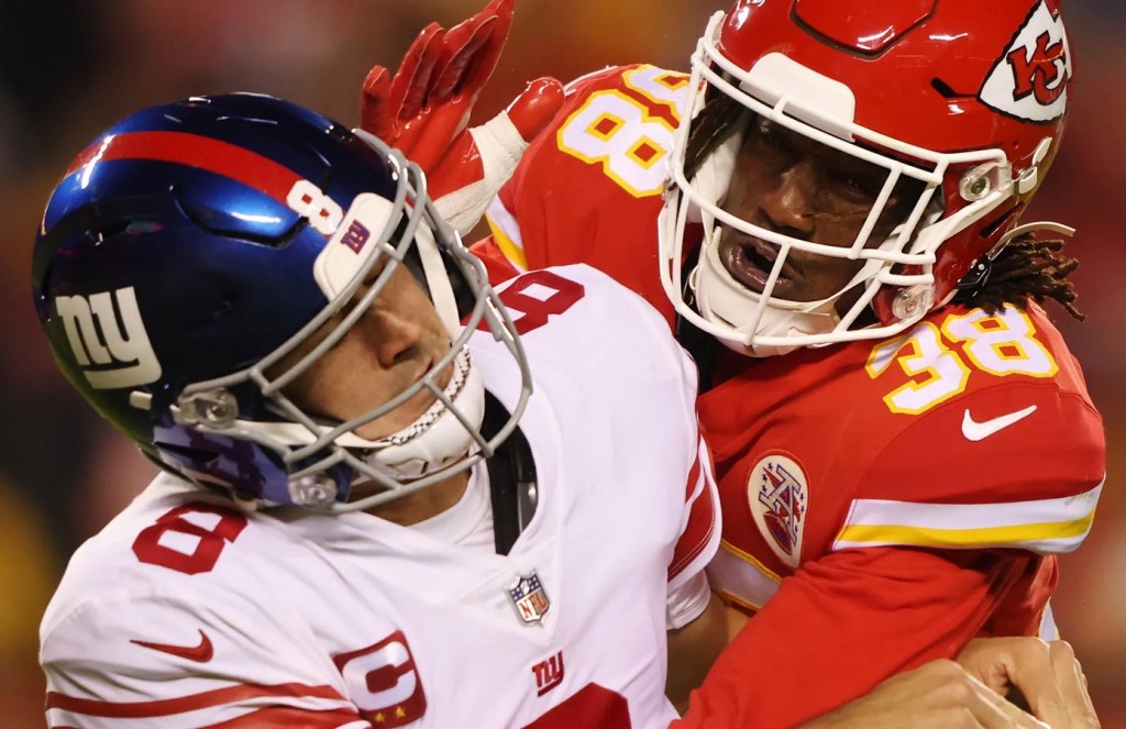 Patrick Mahomes was 29 for 48 for 275 yards with a touchdown and an interception. The interception was his league-leading 10th, and he would have thrown another if not for an offside penalty against the Giants that nullified it.