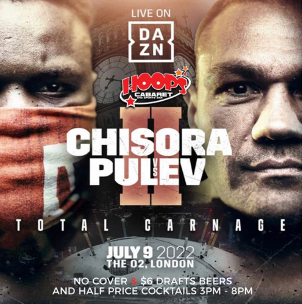Hoops Cabaret in New York City (48 West 33rd Street) is a great place to watch the international boxing event featuring Derek Chisora vs Kubrat Pulev on Saturday night, July 9th.