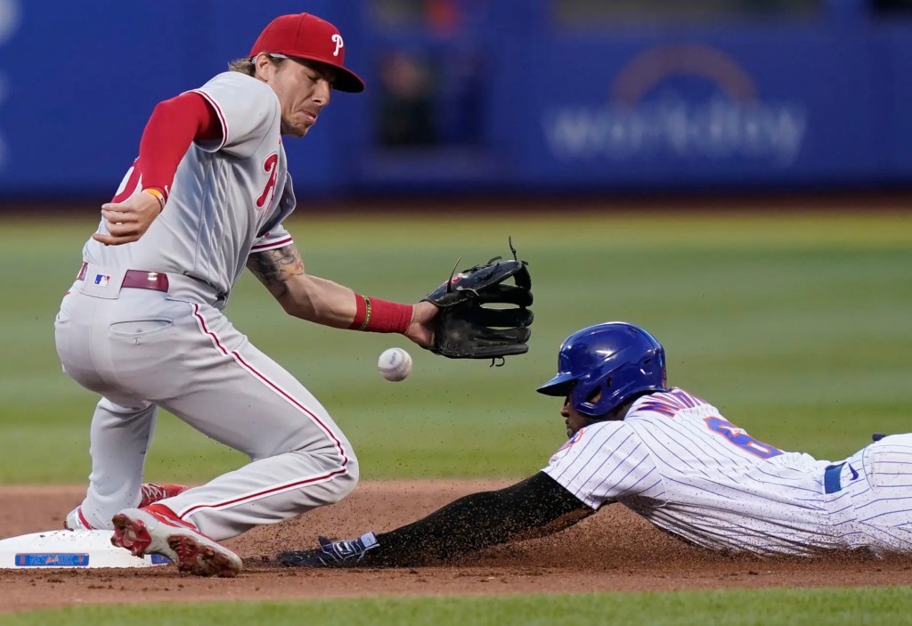 The Mets scored in the first inning thanks to Starling Marte’s legs. Marte singled, stole second and took third base when the throw escaped into center field. Pete Alonso came through again with a single off Aaron Nola for his league-leading 97th RBI.