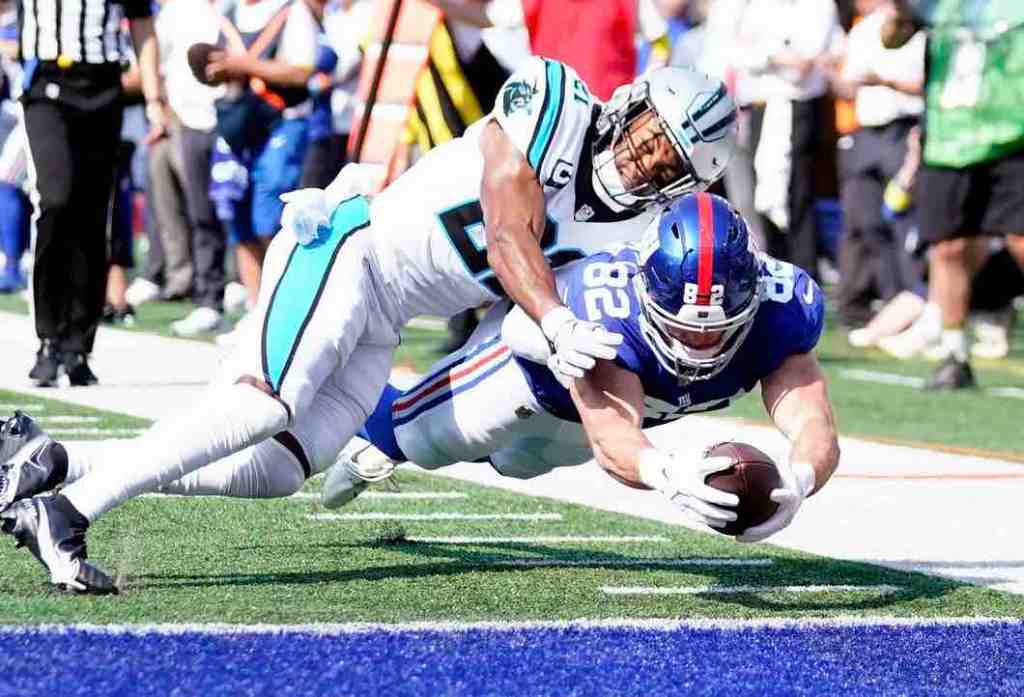 Carolina (0-2) had a chance to tie or go ahead, but a blitzing Julian Love sacked Carolina quarterback Baker Mayfield on third-and-5 to force a punt with 2:06 to play. The Giants were able to run out the clock, keyed by an 11-yard run by quarterback Daniel Jones on a third-and-2 that sealed the victory.