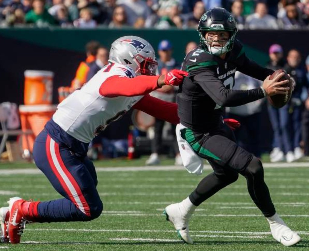 Jets quarterback Zach Wilson threw three interceptions, John Frankin-Myers committed a critical penalty and Gang Green blew a halftime lead in a 22-17 loss to the Patriots. It was New England’s 13th straight win over the Jets and ended a four-game winning streak for the Jets.