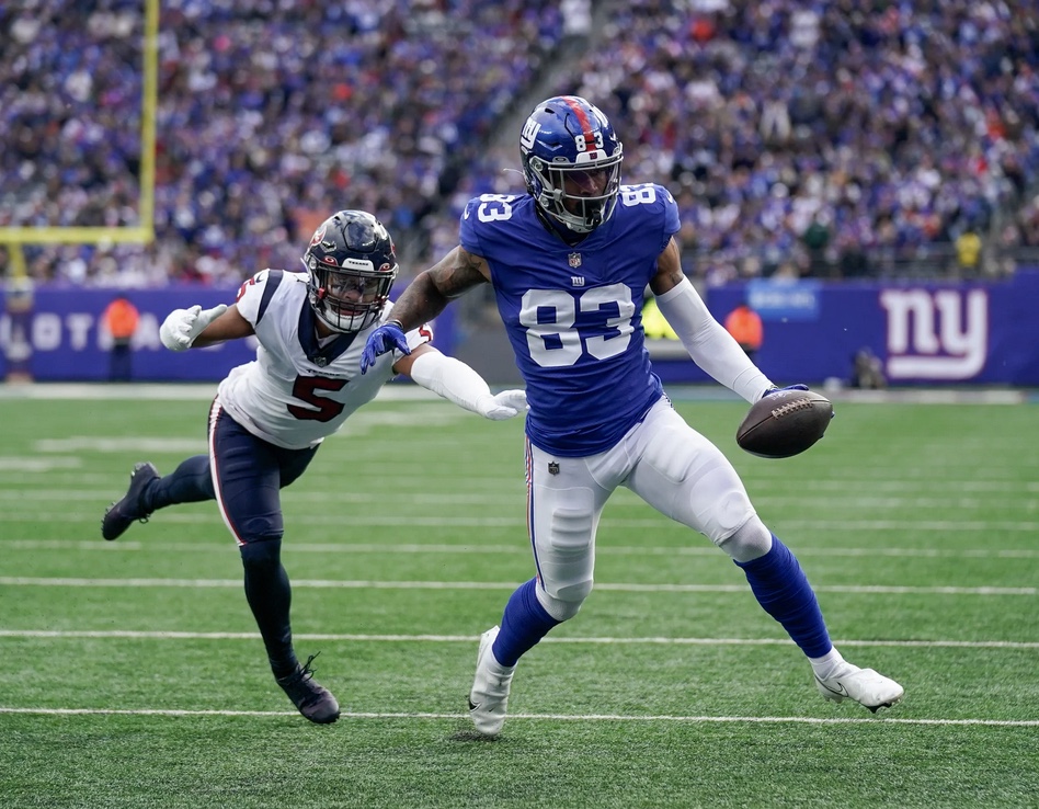 Dane Belton, playing in injured Xavier McKinney’s spot, intercepted Texans QB Davis Mills in the end zone in the fourth quarter with Houston looking to pull within one score.