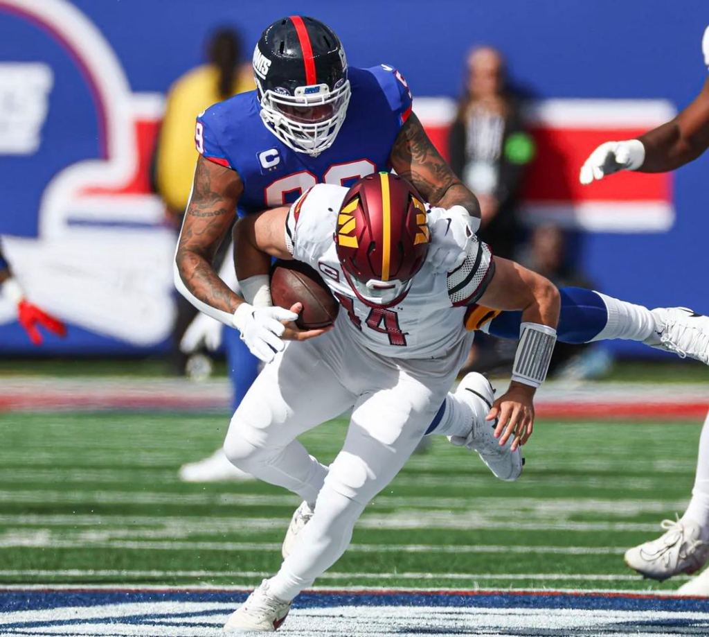 Sam Howell entered the game as the NFL’s most-pressured and most-sacked quarterback. The Giants took full advantage, bringing Howell down six times. Dexter Lawrence exploded for 2.0 sacks, his first two of the season, and Kayvon Thibodeaux added 1.5 of his own.