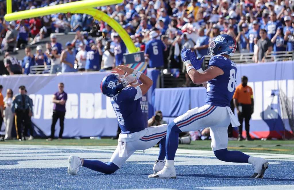 The Giants scored touchdowns on three of four possessions and gained 198 yards in the first half and Skattebo powered into the end zone early in the third.