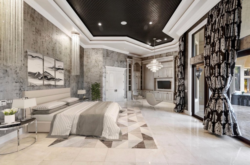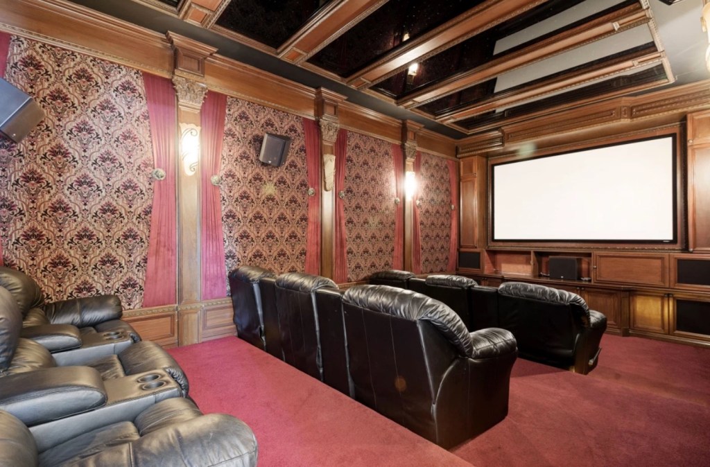 The four-bedroom, 5½-bathroom home features a chef’s kitchen, a “hidden” movie theater, a home office, an indoor bar area with a pool table and a yoga room.